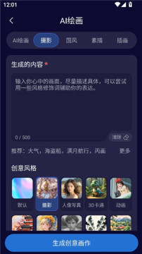 2、选择绘画类型,输入要生成的类容然后选择一种风格。