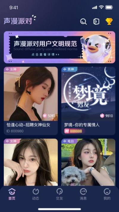 声漫派对app是一款手机免费交友派对软件,广大用户可以在这里邂逅你的恋爱对象,多种交友玩法等你参与,用户可以随时参与更多交友活动,不断扩大你的社交圈子,对软件感兴趣的话不妨点击下载试试!
