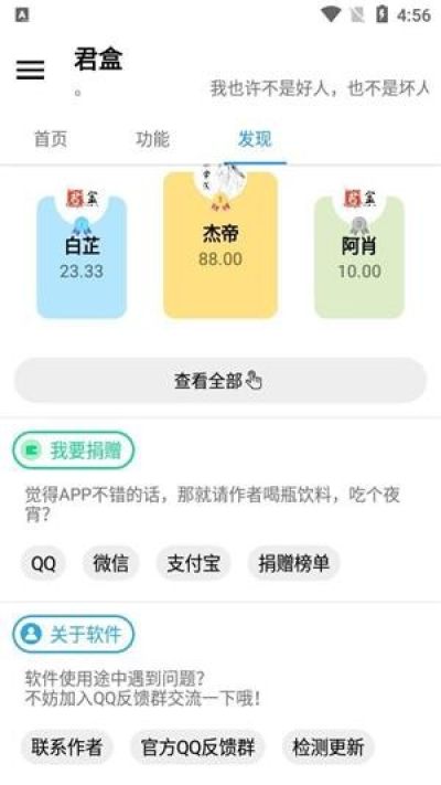 君盒是一款功能强大的安卓辅助工具软件,以其丰富的实用工具和便捷的操作体验,赢得了众多用户的喜爱。这款软件集合了日常工具、qq工具、游戏工具、图片工具等多种功能于一体,旨在为用户提供一站式的服务体验。君盒不仅功能全面,而且体积小巧,不占用过多手机内存,同时其界面设计简洁明了,操作流畅,让用户能够轻松上手。