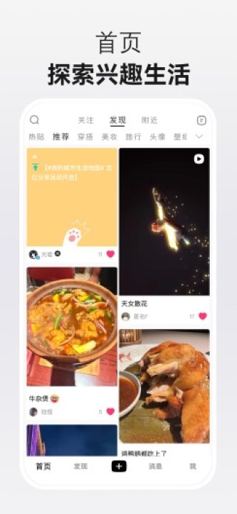 “生活分享+兴趣社交”双核心驱动:区别于纯生活记录平台或纯兴趣社区,将“日常分享”与“兴趣交友”深度结合,用户既能通过生活内容展示真实自我,又能基于兴趣找到同好,形成“内容吸引-兴趣连接-深度互动”的完整社交链路,提升社交质量。