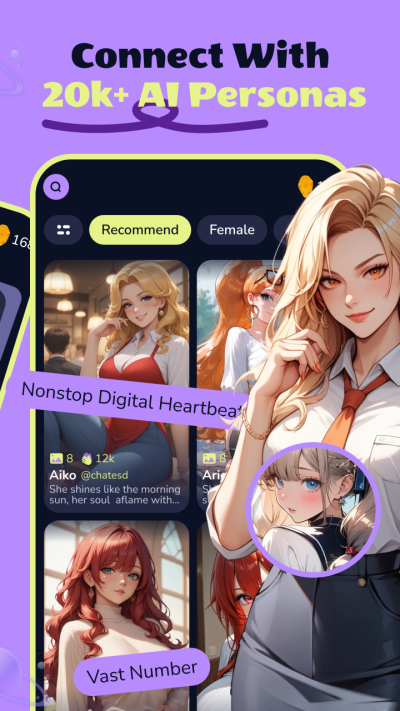 结识形形色色的 AI 好友——可爱的闺蜜、迷人的暗恋对象、睿智的导师,或是梦幻般的恋人。每个角色都有自己的氛围、风格和故事。