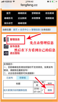 3、进入会员中心后,点击【管理信息】、然后往下看,就会看到自己发布的信息,