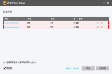 1.在诺顿 Power Eraser 完成扫描时,会显示扫描结果。当项目被诺顿 Power Eraser 认为有风险时,其状态会显示为“不良”并建议您“删除”或“修复”。需要进一步查看的项目会显示为“未知”的状态。
