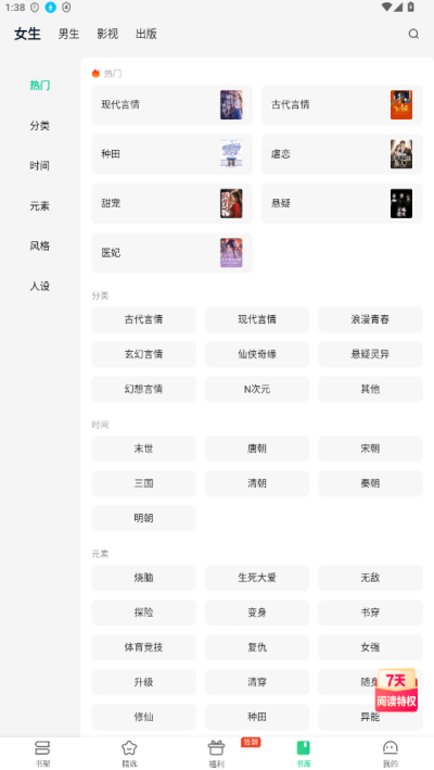 不仅汇聚海量小说,还细分男频、女频两大板块,覆盖都市、言情、玄幻等众多热门分类,同时引入热门 IP(如《倾世锦鳞谷雨来》)抢先看与大神作家作品,满足不同阅读喜好用户的需求,避免书荒。
