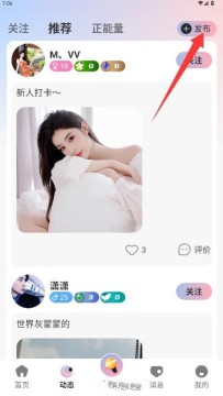 4、进入动态界面,在这里你既能浏览其他用户发布的动态,也可以点击右上角的发布功能,分享自己的动态。