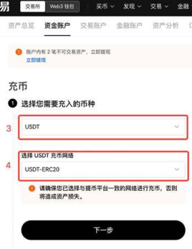 2、选择您需要充入的币种【USDT】一选择USDT可用的充币网络【USDT-ERC20/USDT-TRC20/USDT-OKTC】一【下一步】;注意:选择充值USDT币种时,此地址只能充入Tether(USDT),请勿充入其他币种,否则您充入的资产将无法找回。