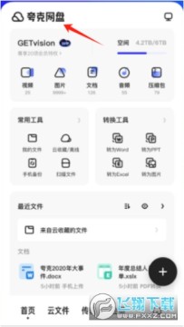 2、点击夸克网盘页面,显示网盘空间及GETvision,有常用和转换工具,可管理文件。