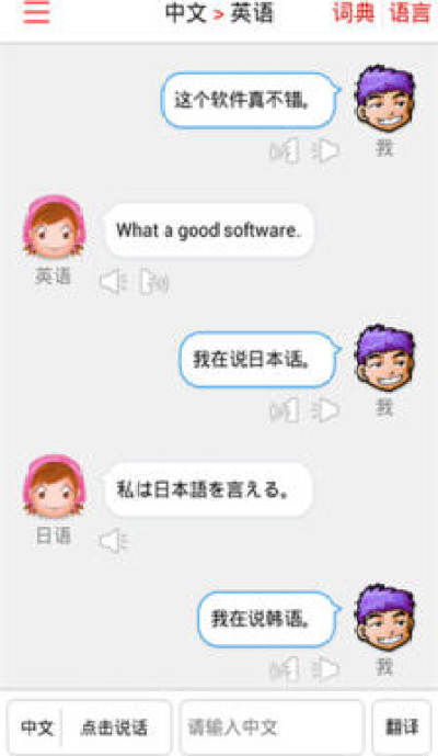 想不想随身配备一位专业的同声传译专家?同声翻译超级版满足您的梦想,无论你是否懂各国语言,只要你对她说话,她会立刻将你的话翻译成外语并朗读出来,同时支持手动和语音输入。强大的智能翻译功能,无需您选择需翻译的语言,省去繁琐的设置,自动识别输入文字。强大的同声翻译体验,配以简洁有趣的对话模式,快来下载体验一把超酷的翻译感受吧。