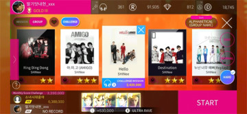 6、superstar smtown游戏有两个模式,普通的关卡Weekly和每天随机打一首歌的Superstar模式,这两个都有刷榜奖励。Weekly的榜单按所有歌手中每个歌手分数最高的五首歌的分数总和排名,达到一定的名次可以提升等级,获得奖励和金币加成。