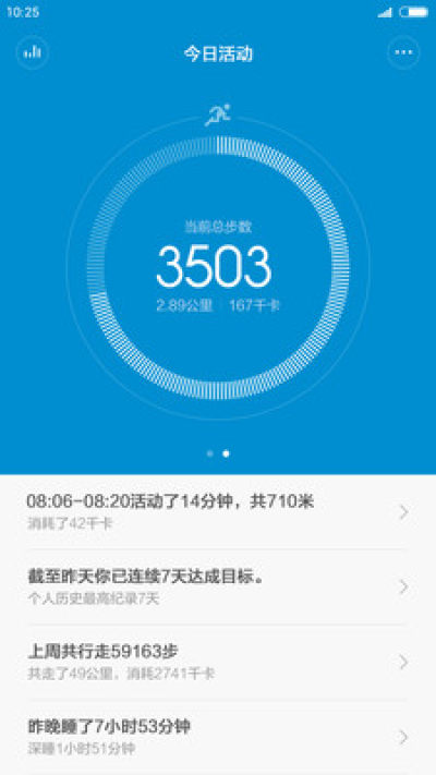 可查看小米体重秤为你记录的每天运动、睡眠、卡路里消耗、体重信息。
