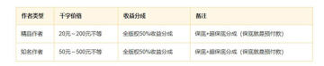 签约模式:实行“保底+超保底分成”,保底价格区间为千字20元至500元,作品超保底后享受分成收益,与平台风险共担、收益共享。