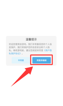 1、点击温馨提示里的同意并进入游戏。