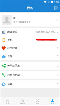 1、点击我的;进入我的后可以看见我们用户的昵称与头像,下面还有一长列的功能:所属单位、手机、我的收藏、云盘、分享个好友、后台自启动、设置,这个时候我们直接点击所属单位;