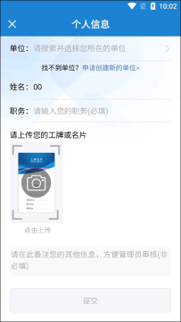3、进入后我们需要填写单位类型、查找单位、填写自己的姓名和职务,等最后上传自己的工牌或者名片就好了,当然如果你有其他的事情需要备注可以填写到底下的备注栏、填写完成后可以看见底下的提交键就从灰暗的样子变成高亮的样子了,我们点击它就完成绑定了。
