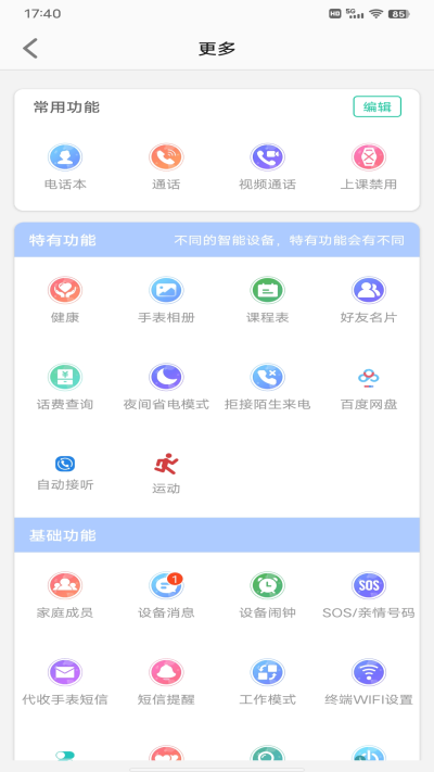 3、在功能列表中,找到微聊功能板块,可开启家庭群聊、语音对讲,还能设置拒绝陌生来电、夜间省电模式等,丰富使用体验。