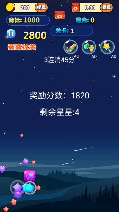 实用道具助力闯关:包含魔法刷子等特色道具,可帮助消除更多星星、刷新高分记录,关键时刻突破关卡难点,提升闯关效率;