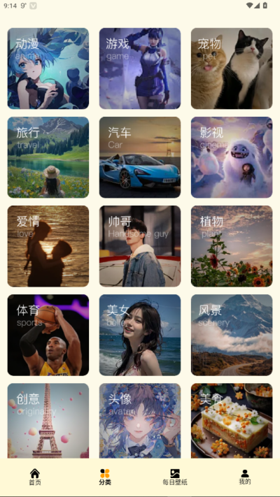1、分类超详细:覆盖动漫、游戏、风景等九大热门类别,分类逻辑清晰,精准匹配不同喜好;