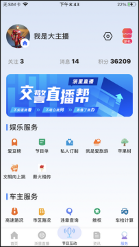3、在服务板块可以看到主要有娱乐跟车主两大类~查看喜欢的主播榜单,查看路况和违章情况都在这里。