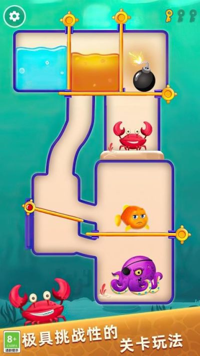难度渐进式关卡设计:关卡难度随解锁逐步提升,鱼儿被困深度增加,需玩家不断积累技巧才能顺利通关,避免初期难度过高或后期缺乏挑战的问题;
