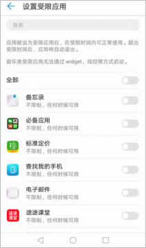 4、然后设置受限的应用,点击进入后选择不希望孩子在学习过程中使用的应用