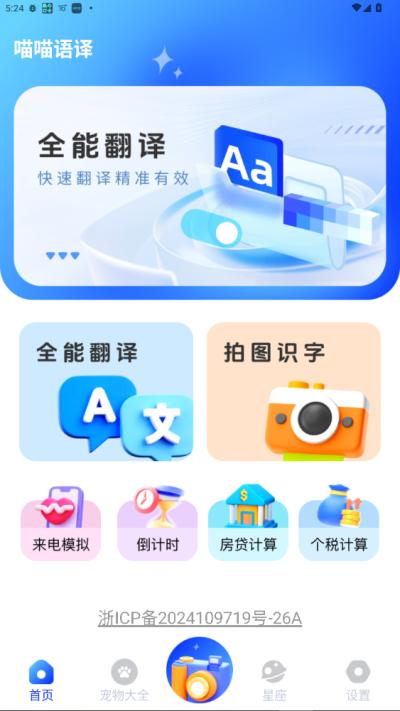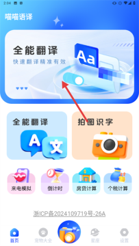1、首页点【全能翻译】体验精准翻译,或用【拍图识字】,还能试【来电模拟】等工具。