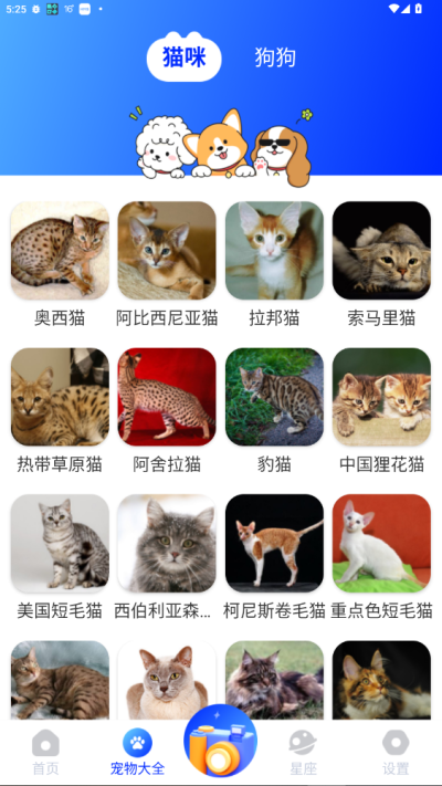 2、切换【宠物大全】页,浏览【猫咪-狗狗-水族】分类,学习宠物喂养知识。