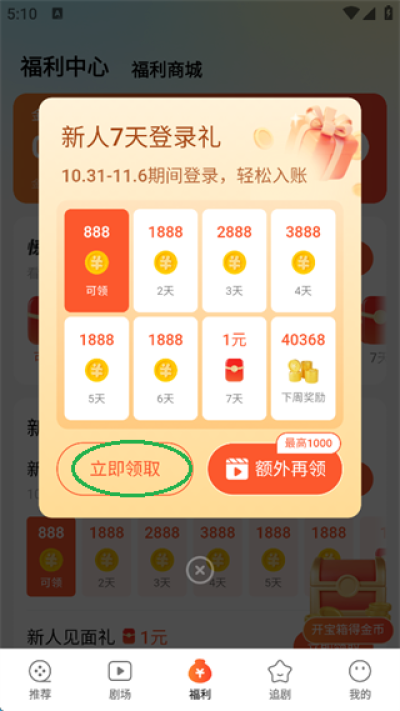 2、点击弹窗左下角的“立即领取”,可以领取大量金币,而且随着天数增加。
