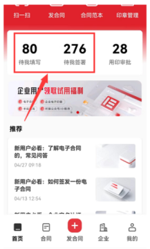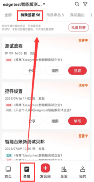 1、通过首页中【待我填写】或【待我签署】快速找到需要签署的合同,或者在合同页面中选择【待我签署】。
