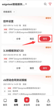 2、找到需要填写的合同,点击【填写】,会跳转到合同填写页面,控件填写完后,点击【提交文档】即可。