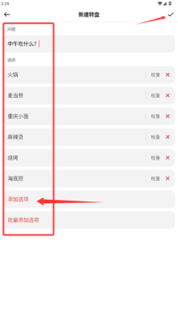 1、进入新建转盘界面,输入讨论主题并设置选项内容,确认保存设置。