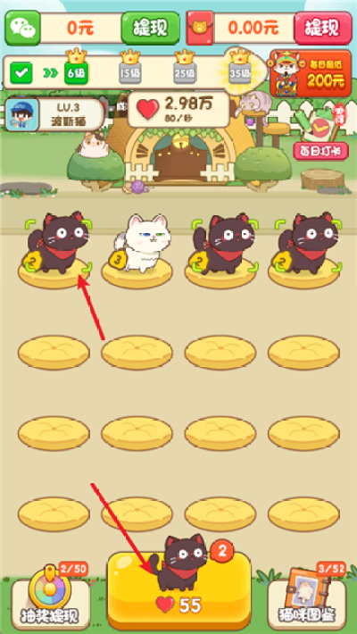 拖拽合成:将两只相同等级的猫咪拖到一起,合成更高级的喵星人;
