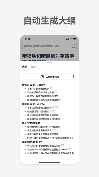 3、利用AI功能轻松生成大纲、思维导图以及展示所需的演示文稿,提升效率。