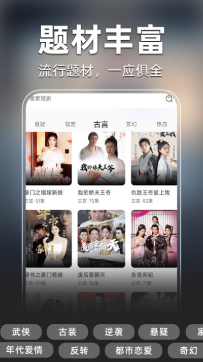 2、题材丰富多元:从浪漫爱情(校园 / 都市)到搞笑幽默、古装历史,题材无死角,适配不同兴趣用户;