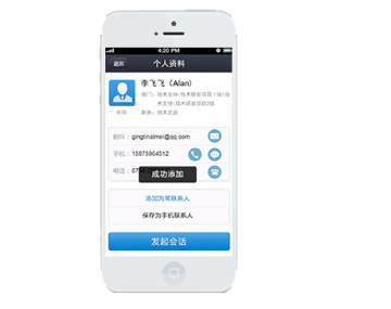 - 可向联系人发起会话、发邮件、打电话、发短信
