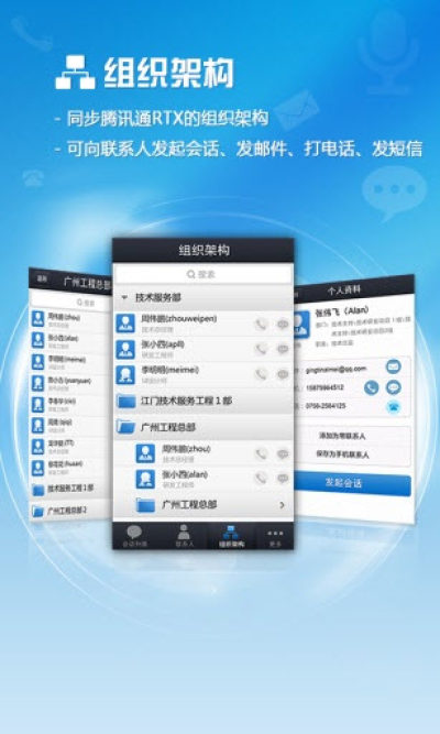 信达通讯录(RTX手机版)是围绕移动互联网应用特点设计的新一代企业消息工具,以企业组织架构为基础,搭建动态实时的企业通讯录。并与腾讯通RTX对接,实现RTX手机版的功能,可与RTX收发信息、查看RTX组织架构、查看人员信息及是否在线等,功能非常强大,是企业办公必备的聊天通讯软件!