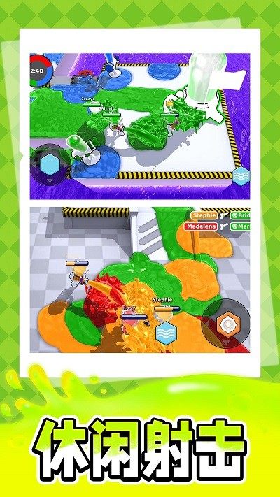 游戏聚焦休闲射击场景,构建了 “颜料射击 + 地盘占领 + 闯关进阶” 的核心玩法体系。核心逻辑围绕 “轻量化竞技体验” 展开:针对操作需求,设计极简操控模式,无需复杂技巧即可快速上手;针对核心玩法,玩家需使用各色颜料武器,通过射击将场景地盘染成己方颜色以实现占领,同时精准瞄准击败敌方对手;针对趣味需求,搭配简约卡通画风与闯关模式,每一关设置不同地形与对手配置,从基础场景到复杂地图逐步提升挑战难度,适配休闲玩家的娱乐需求,实现 “打开即玩,玩即上瘾” 的体验。