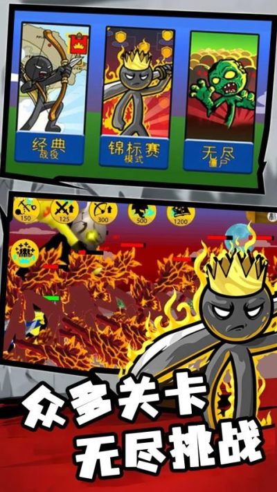 火柴人混战无广告版是一款以火柴人为主角的经典策略战争游戏,玩家需要训练矿工,开采黄金支撑兵种训练与科技研发,训练不同的兵种根据克制关系来消灭敌人,玩家可操控单个单位进行精准攻击或撤退,根据每关敌人配置与地形不同,需针对性调整战术赢得胜利!