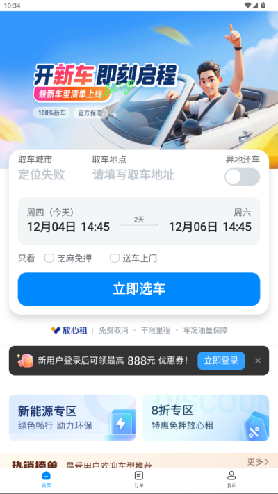 2、浏览可用车型和价格明细,选择送车上门或到店自提方式,确认订单并享受免押金服务。