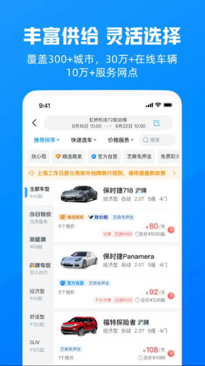 3、特色服务减负担:提供免押金、送车上门、不限里程、异地取还等服务,降低租车门槛,提升出行灵活性;