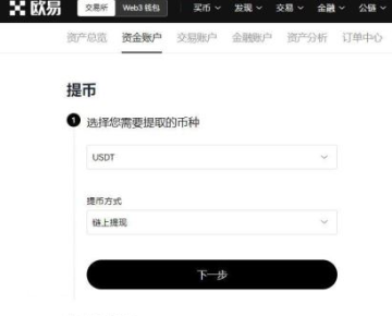 6、在提现页面选择币种【USDT】,提现方式选择【链上提现】点击下一步