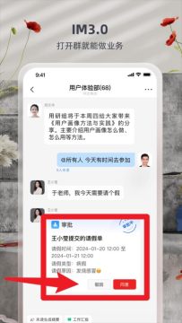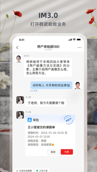 1、在IM3.0群聊中即可发起请假申请审批,快速实现日常事务线上流转与高效处理。