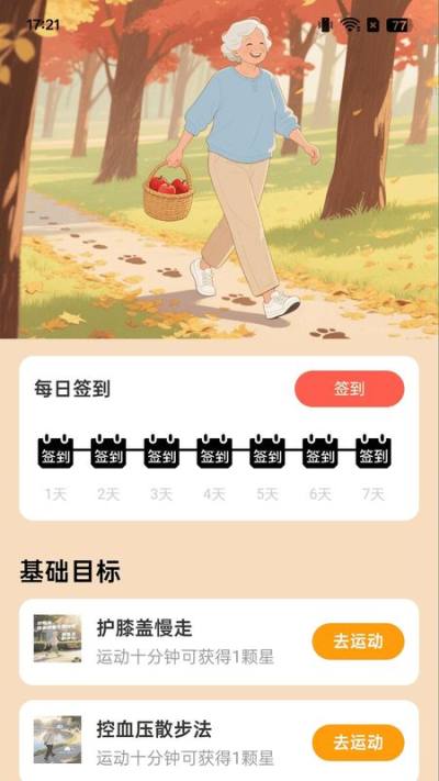 目标激励体系: 设有每日签到与连续打卡机制,积累您的坚持天数。完成设定的基础步数或运动目标后,即可解锁“运动之星”等虚拟成就勋章,以游戏化的方式见证您的每一次努力与进步,持续激发运动热情。