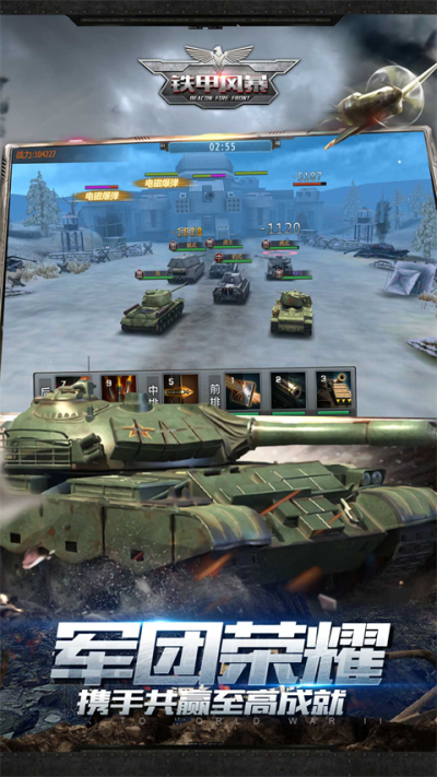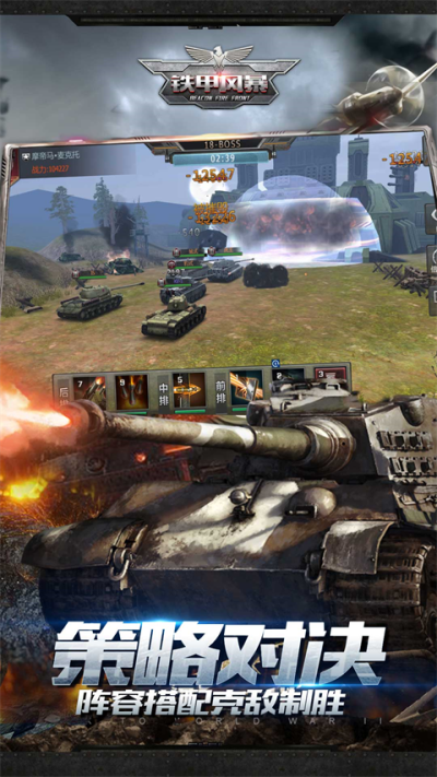 策略排兵布阵:在3×3战场中布置前排重坦抗伤、中排输出坦克火力覆盖、后排辅助坦克提供支援,激活联合技提升作战效率。