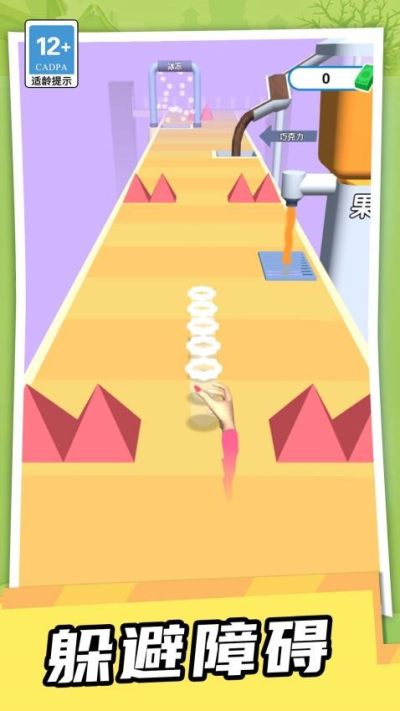 3、障碍物设计融合厨房元素,打蛋器会持续旋转阻挡路径,巧克力喷泉则会造成短暂黏着减速的效果。