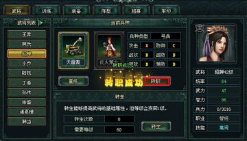 每个武将都具有一定成长值,武将转生后,依据成长值,获得一定的属性成长,初始转生需要武将等级为60级,每转生一次在此基础上增加5级。初始属性很差的武将,通过转生一样能培养成为超级武将。