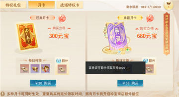 最后推荐两种氪金获取军资的方法:购买大小月卡和金玉富贵。大月卡每天可领2000军资,富贵袋任务可额外领取2000军资。小月卡每天可领1000军资,富贵袋任务可额外多领1000军资。