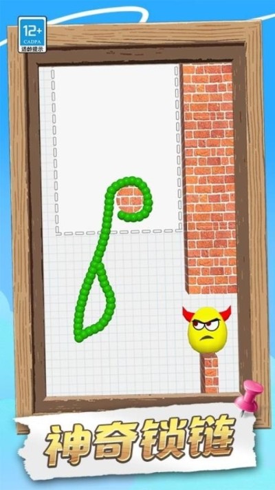 1、在【神奇锁链】关卡,绘制绿色锁链绕过砖墙,避开下方敌人,确保锁链路径正确,完成关卡。