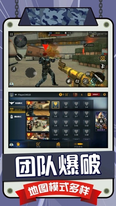 采用高清3D画面风格,细腻还原复杂建筑物、武器装备等细节,搭配真实的枪战音效,打造沉浸式战场环境,让玩家身临其境感受刺激枪战体验。