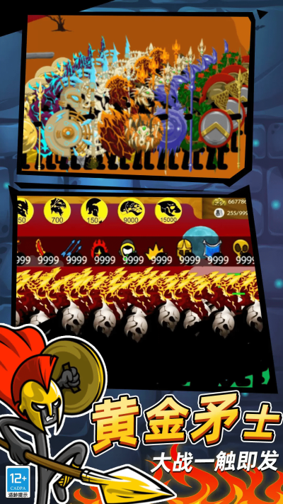 第十二关:最终对战,这时敌方用的是熔岩皮肤,十分强悍,前期两排剑士一排弓箭手,7个矿工发展经济(备上淘金热*3)后期养两巨人开路,两排弓箭手掩护,四排剑士拆雕像(备好剑士狂怒*2,一个拆