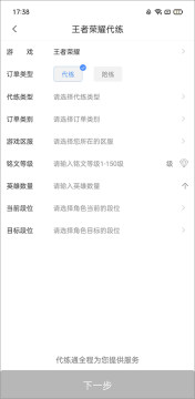 2、输入订单的信息内容,在这里输入代练类型、游戏区服、铭文等级、英雄数量、当前段位等。